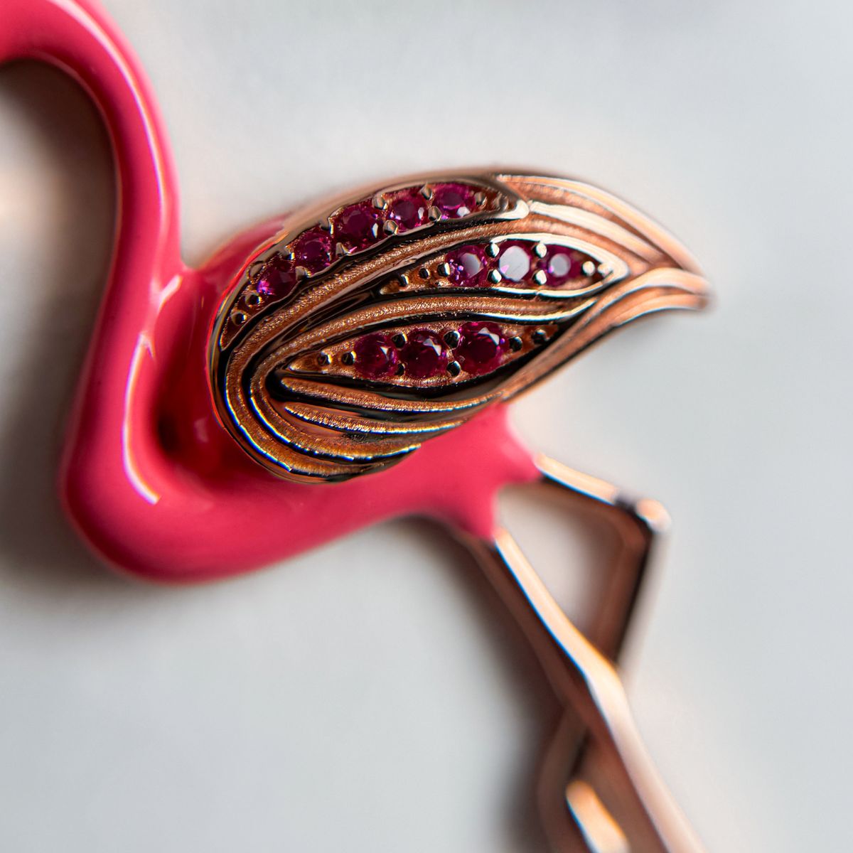 Flamingo-shaped jewelry on a light gray background