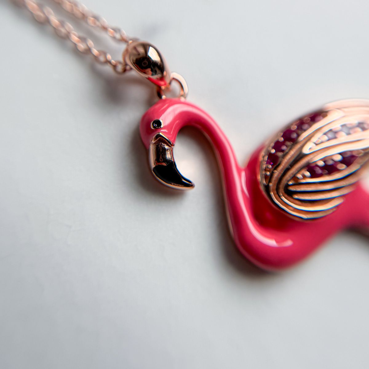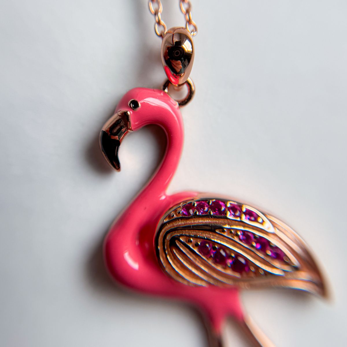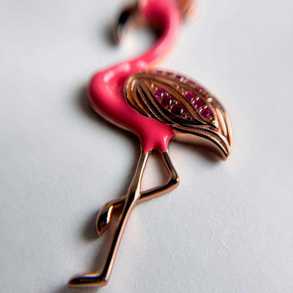 Pink flamingo-shaped pendant with gemstones on a light gray background