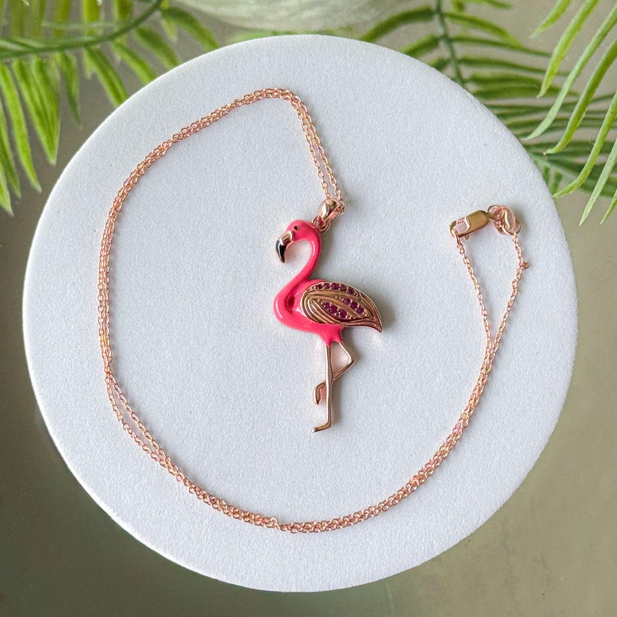 Necklace with a pink flamingo pendant on a white stand with green leaves in the background