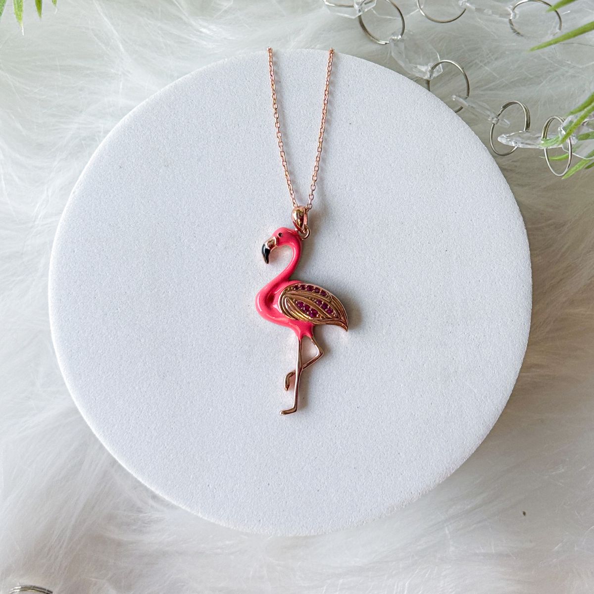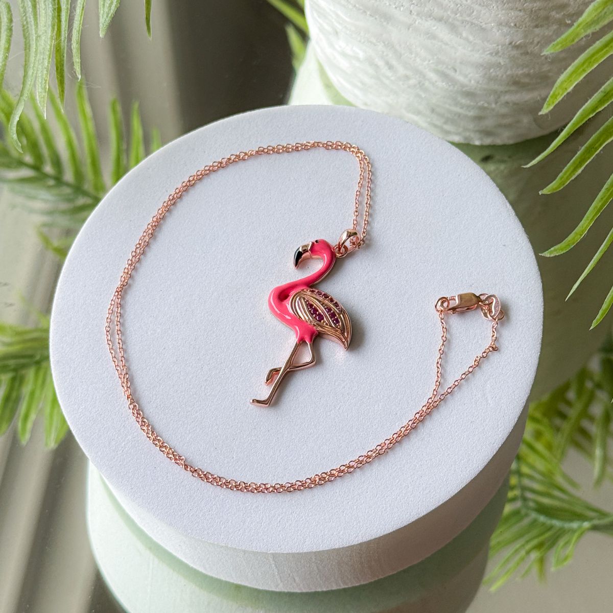 Necklace with a flamingo pendant on a white stand with greenery in the background