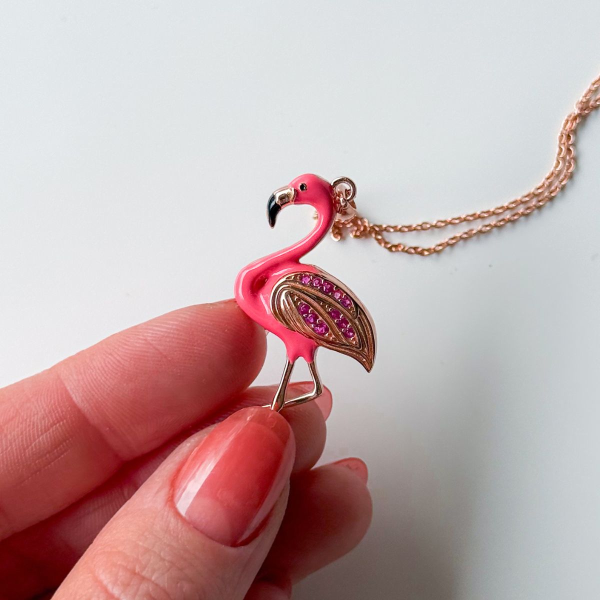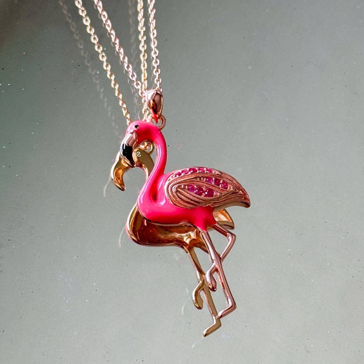 Pink flamingo-shaped pendant on a chain against a light gray background