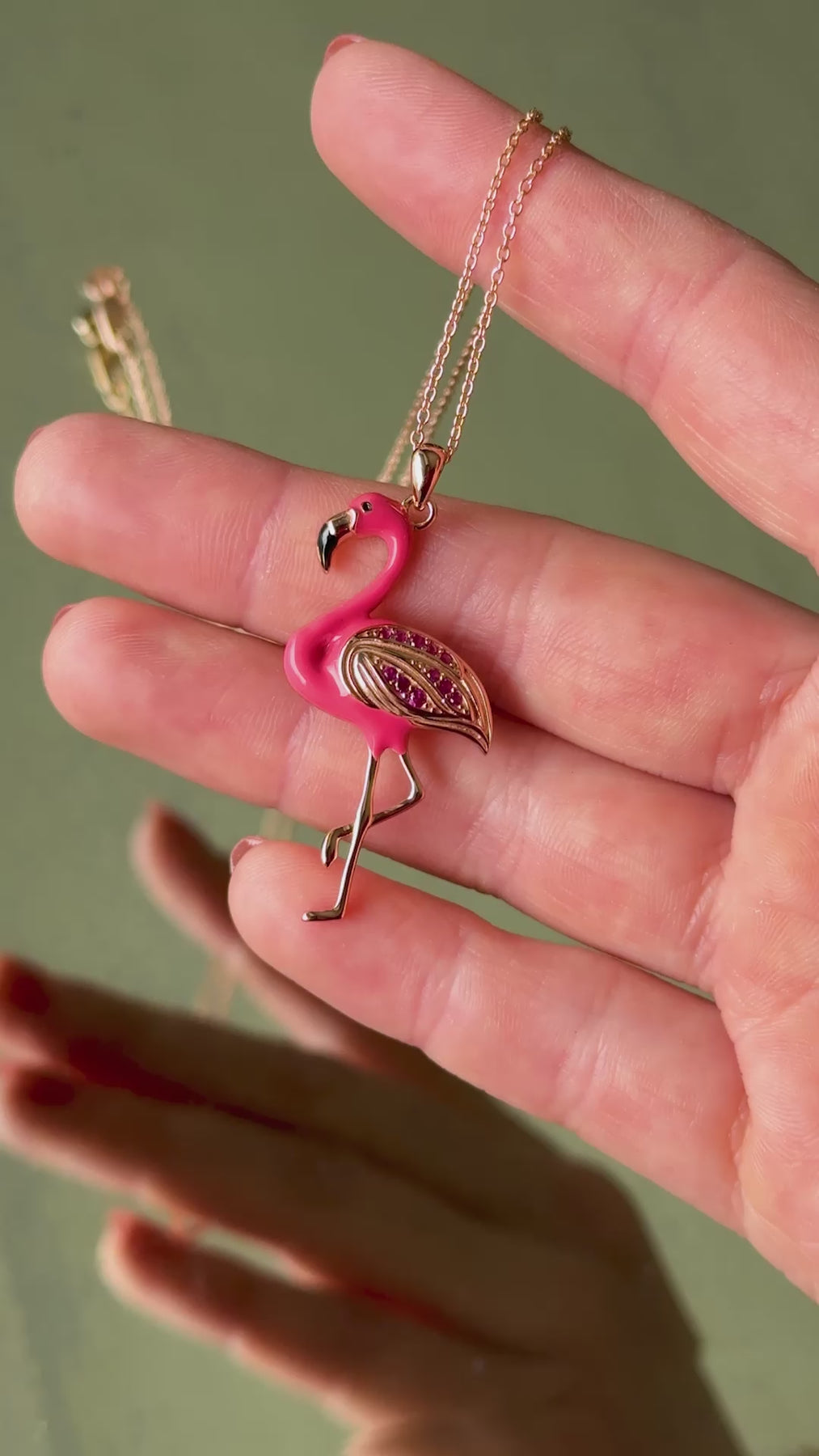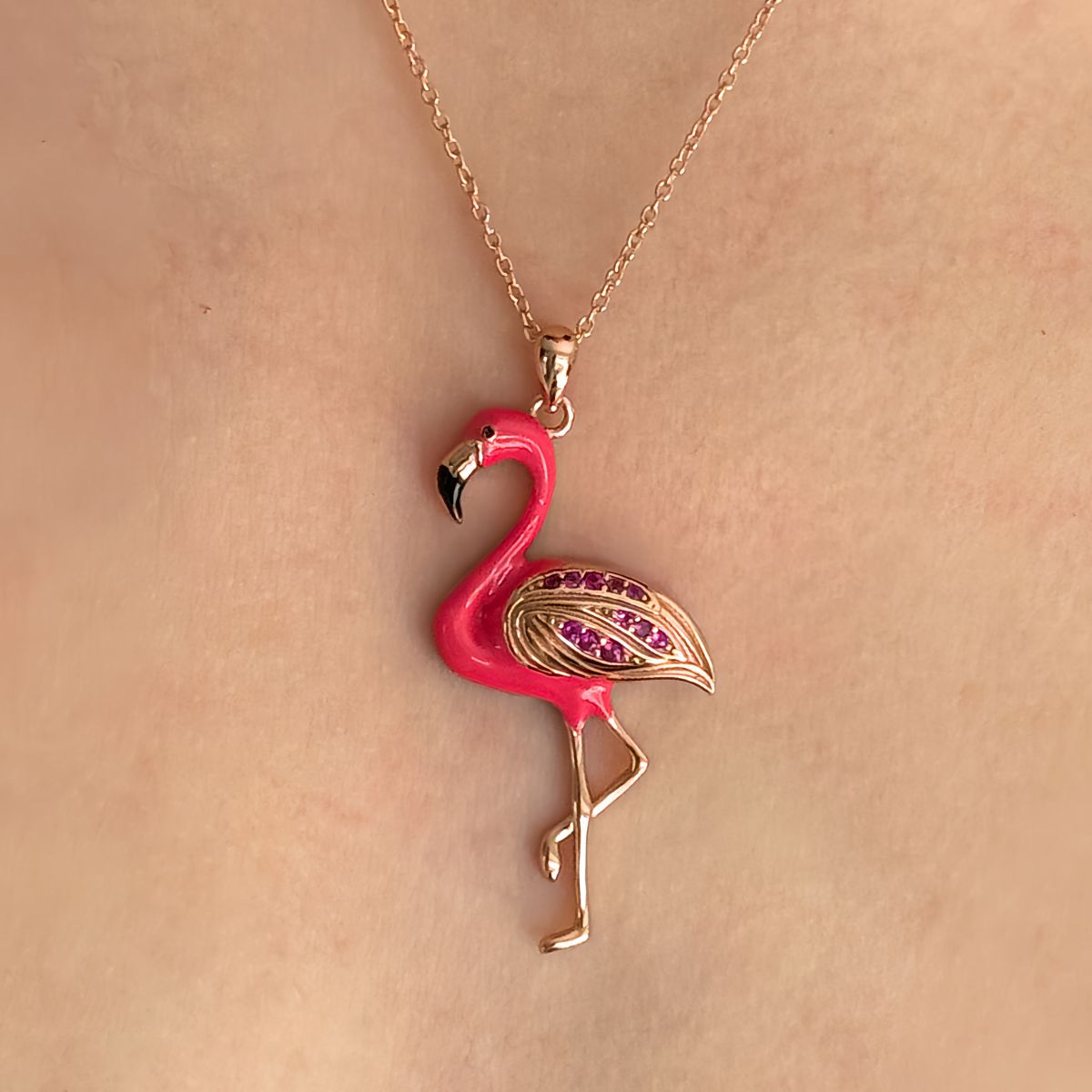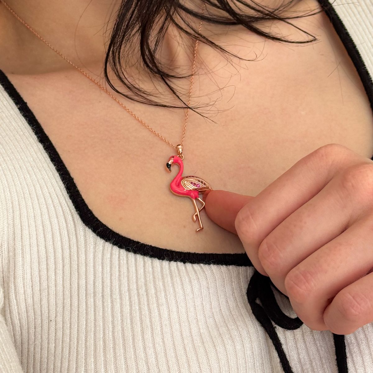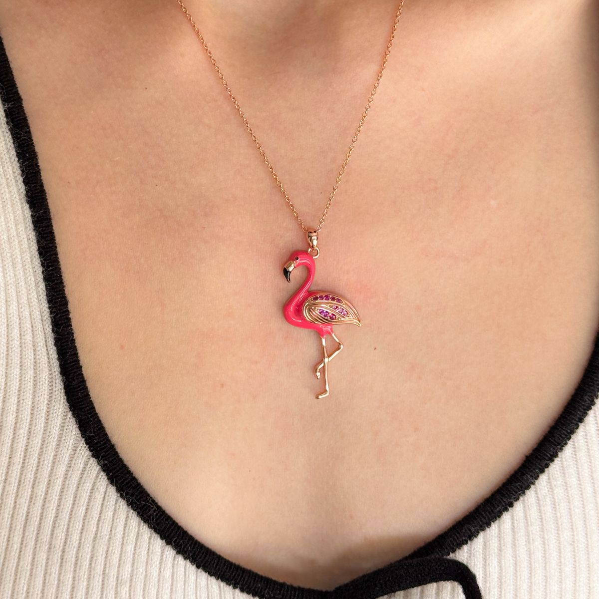 Necklace with a flamingo pendant worn by a person